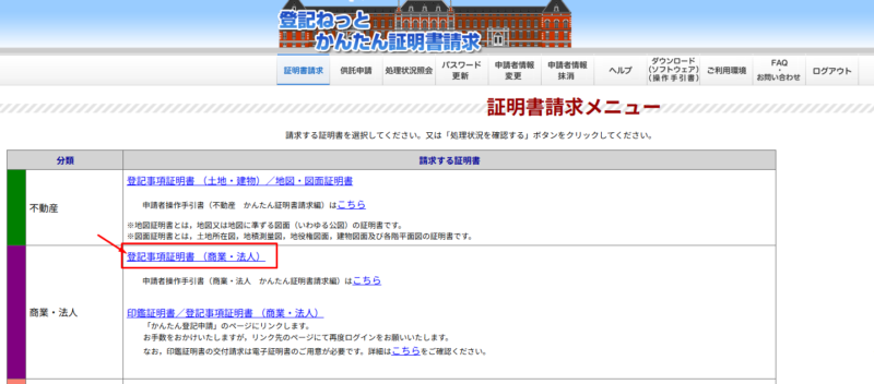 「登記事項証明書(商業・法人)」をクリック。