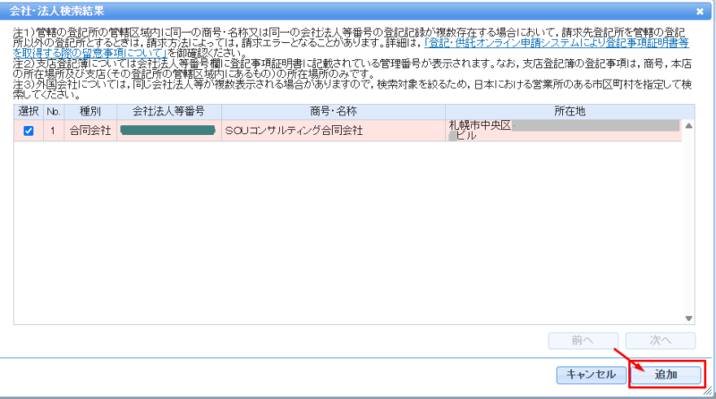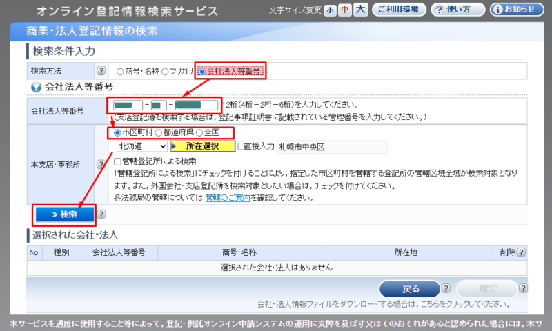 「会社法人等番号」を選んで、番号(12ケタ)を入れて、所在地を選んで「検索」をクリックし、