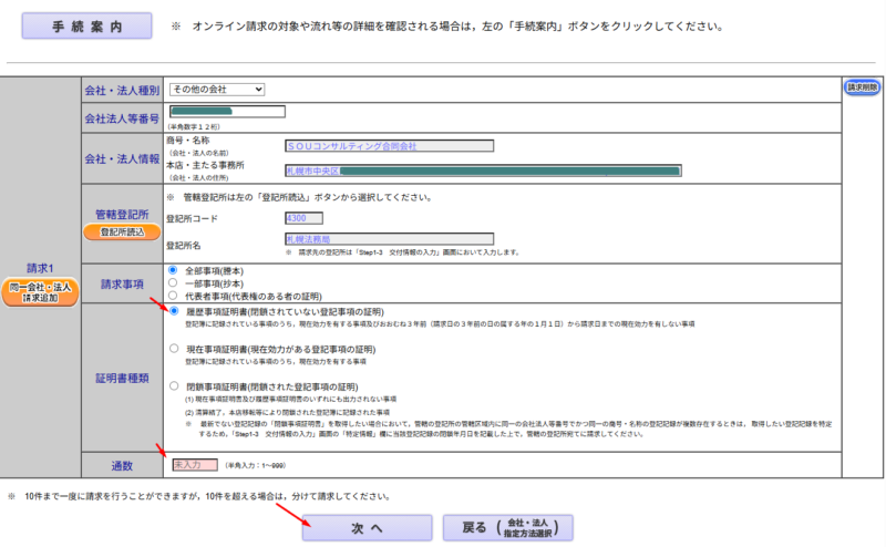 ここで、「オンライン 会社・法人検索を使う」パターン、「会社・法人情報を直接入力する」パターンを選びます。