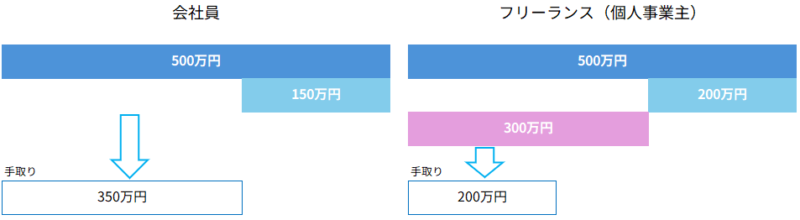 ここで、会社員とフリーランス(個人事業主)それぞれの場合で前述の例をもとに比較してみるとこうなります。