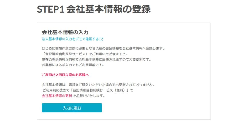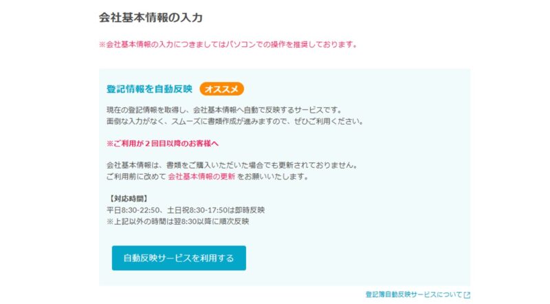 [会社基本情報の入力]とありますが、登記情報を自動反映すれば一から入力しなくてすみます。