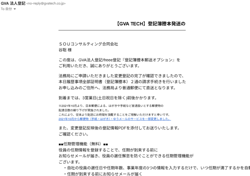 変更登記ができたときは、このようなメールで状況を知らせてくれるのも便利です。