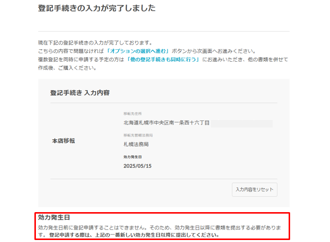 この日以降の日付で変更登記されますのでご注意を(赤枠のところでも書かれていますが)。
