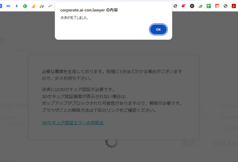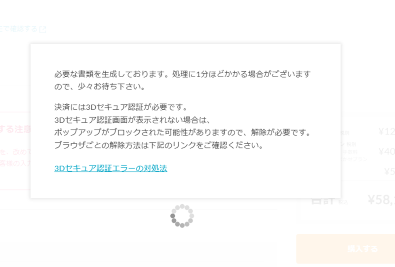 具体的には、このような3Dセキュア認証の画面が一瞬で消えてしまい決済できないという現象でした…。