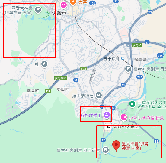 伊勢神宮には外宮と内宮の2つの場所があり、内宮の近くにおかげ横丁はあります。
