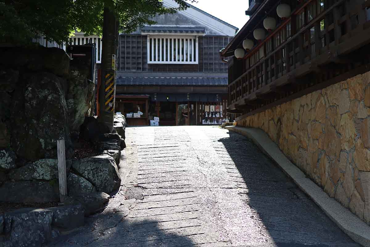 横丁にたくさんのお店が立ち並んでいる中、川(五十鈴川)へ抜ける下り坂の道があります。