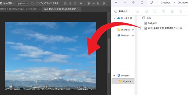 この写真データの上に、先ほどの手書きした名前の画像データをドロップしましょう。
