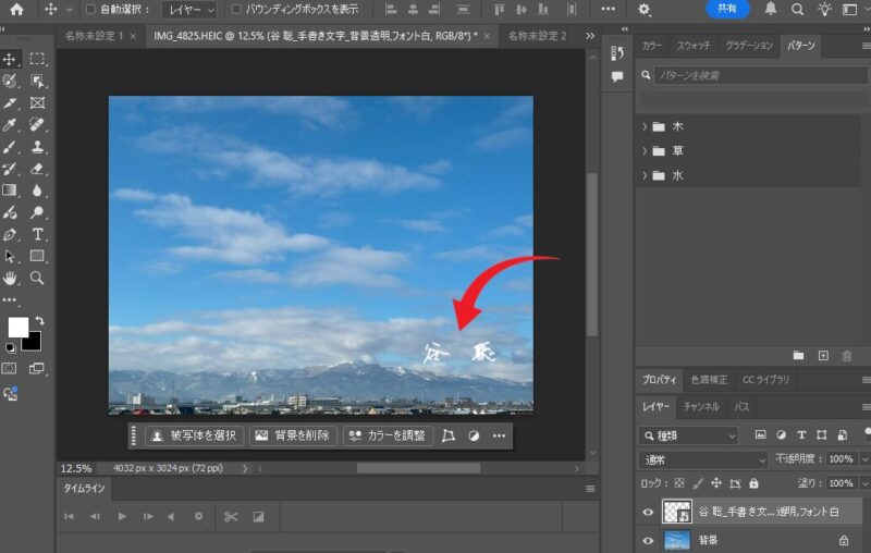 次に、手書きした名前の画像データを写真データに取り込んで合成させていきます。