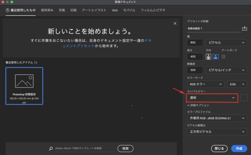 Photoshopの新規ドキュメントを開いて、[カンパスカラー]で透明を選び、