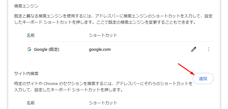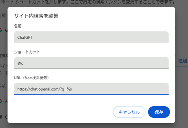 前述と同じようにChromeの設定画面から、「検索エンジン」→「サイト内検索を編集」で、このように設定します。