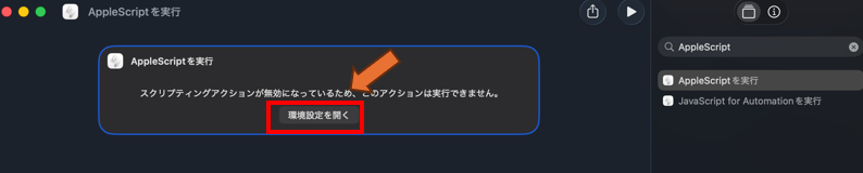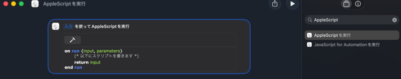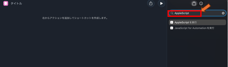 画面右側のところに「AppleScript」 と入力すると、その直下に出てくる「AppleScriptを実行」をダブルクリック。