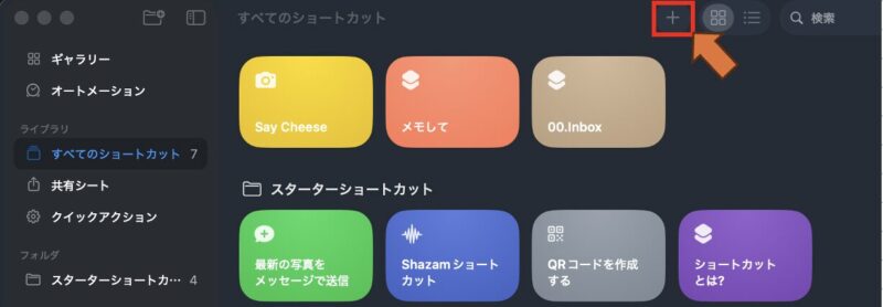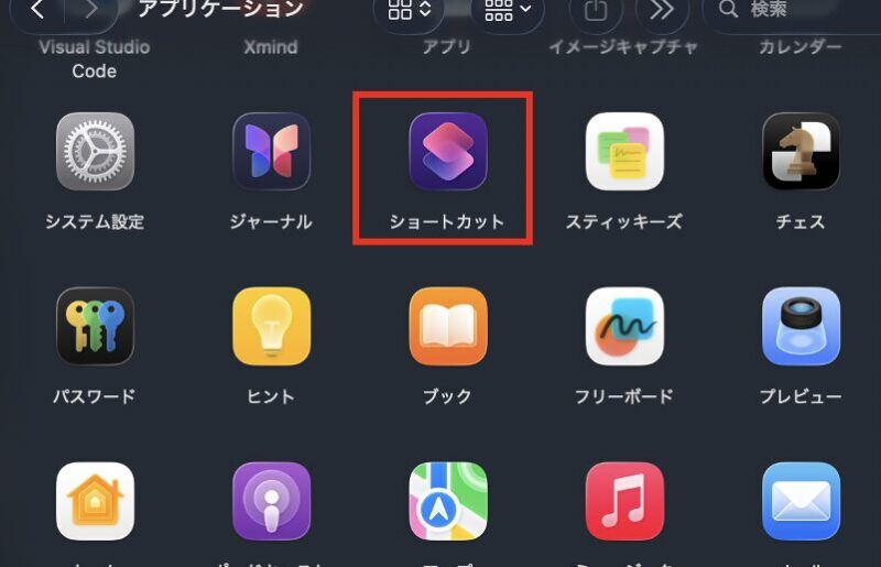 まず、「アプリケーション」を開いて、「ショートカット」を開きましょう。「S」のようなアイコンです。