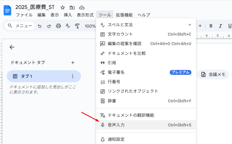 まず、Googleドキュメントを開いて、「ツール」→「音声入力」をクリックします。