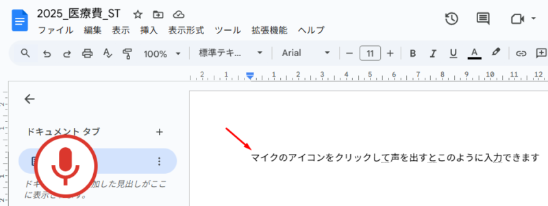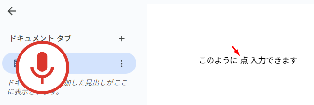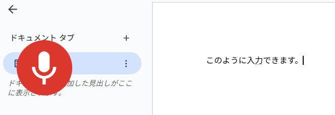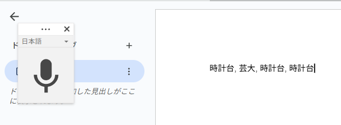 マイクのアイコンをクリックし赤くなってから声に出すと、このように入力されます。
