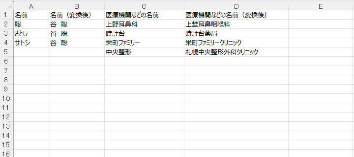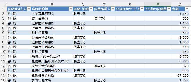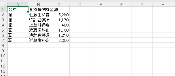 ここでは、A列→「名前」、B列→「医療機関などの名前」、C列→「金額」とします。