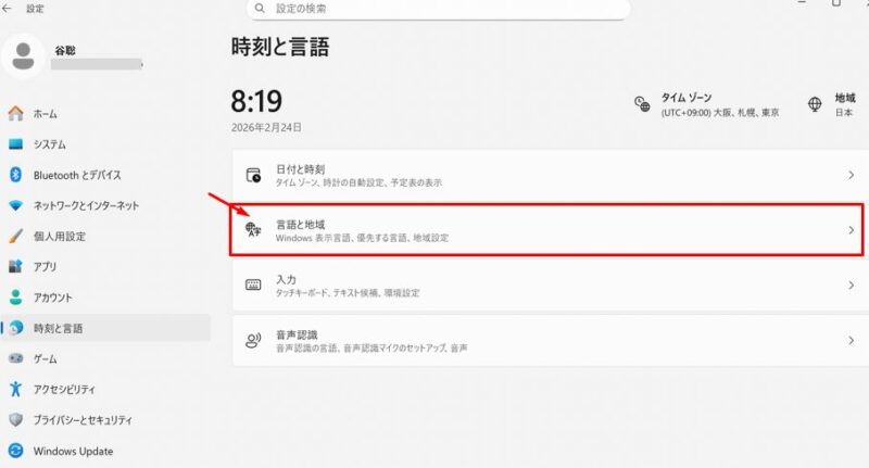 Windowsの「設定」から、「言語と地域」をクリックして、
