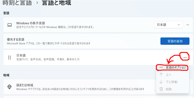 日本語の「…」をクリックし、「言語のオプション」をクリックしましょう。