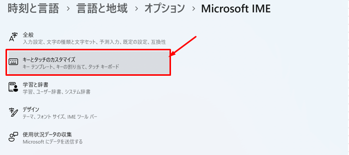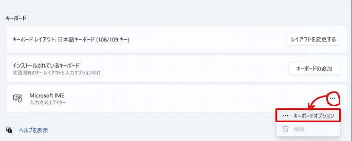 キーボードの中の項目、Microsoft IMEの「…」をクリックして、「キーボードのオプション」をクリックして、