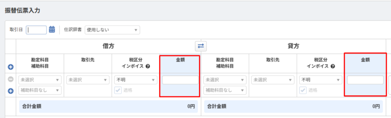 たとえば「振替伝票」。MF(マネーフォワード)では、こういった画面。
